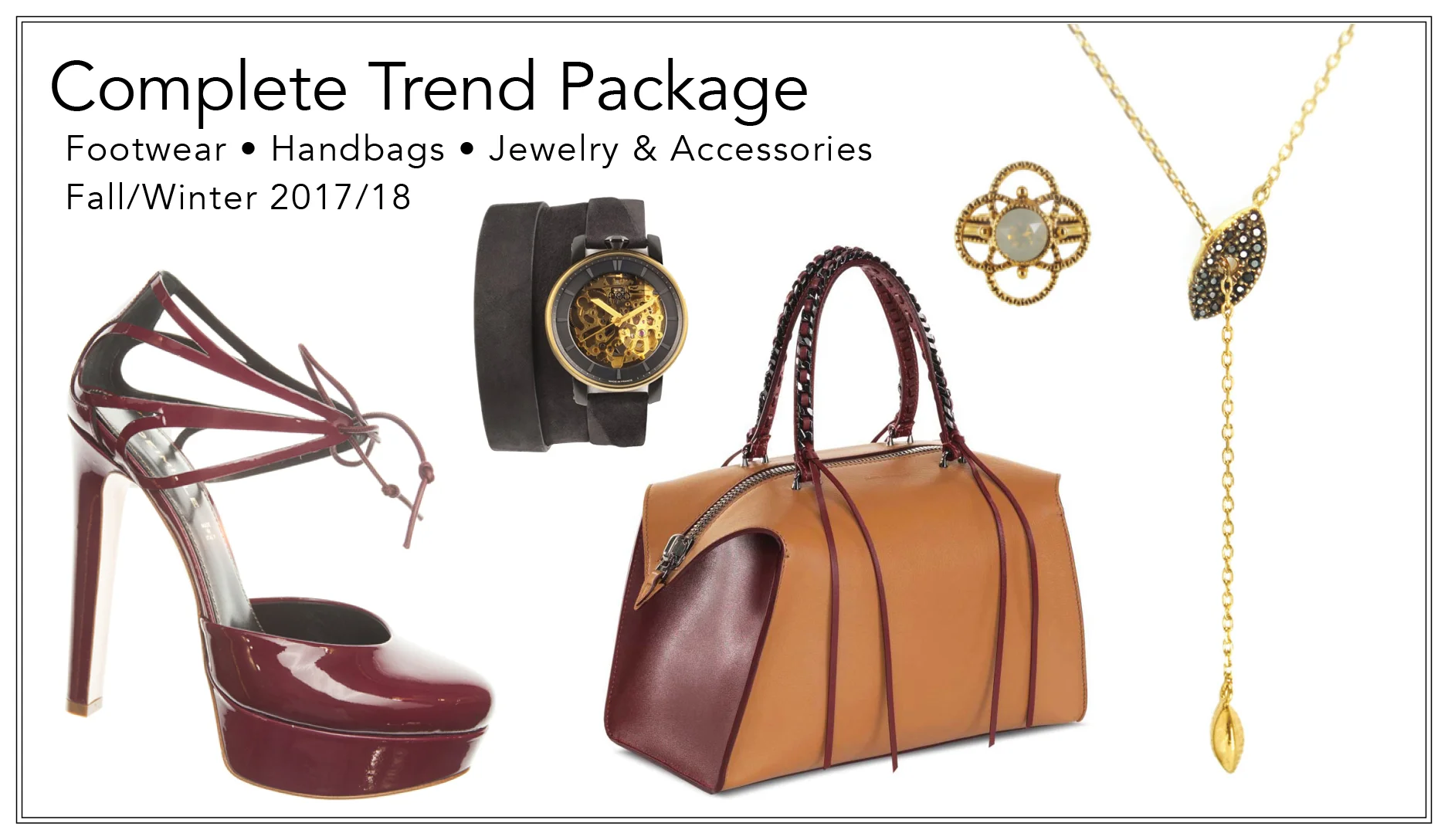 The Complete Trend Package includes the complete collection of Footwear, Handbag & Jewelry Trend Forecasts, the Colour & Materials Forecast, the Trend Forecast and the Designer Collection Analysis.
