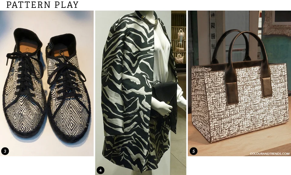 Fresh prints like abstracted zebras, scribbly lines and diamond patterns put a new spin on black and white on a spring coat, a tote bag or a casual lace up fabric bootie.