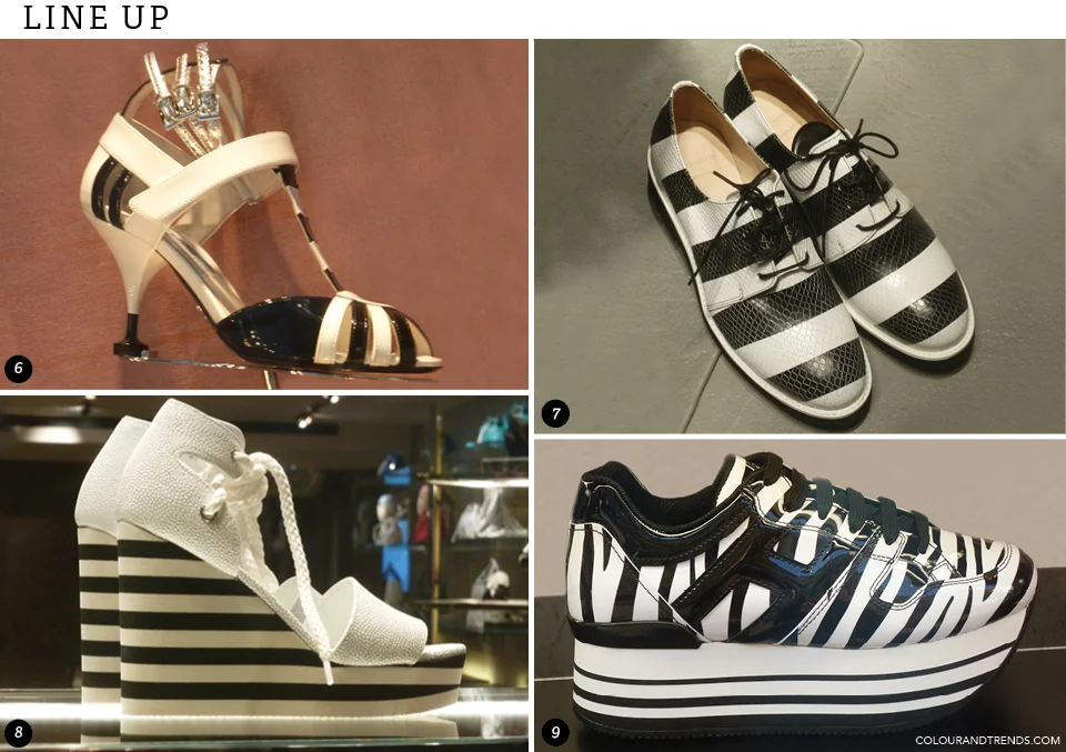 Bold stripes, zebra stripes and simple alternating stripes went across the footwear spectrum, from casual wedges to dressy t-straps, from tailored oxfords to comfort ath/leisure shoes. Patent leather was a favourite material, and jailhouse stripes over a subtle snake print added a whole dimension.