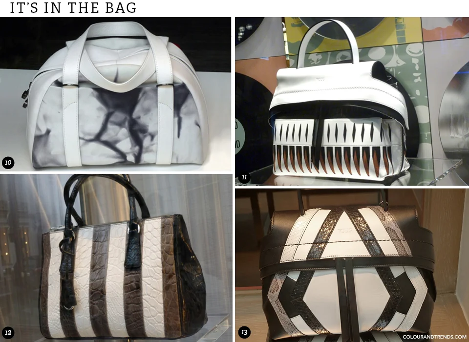 Diffused tie-dye, pronounced stripes on croco or on delicate snake prints alternating with smooth leathers created new graphic patterns. Note that sometimes a third colour was added into the mix, either taupe or light brown, giving handbags in this classic colour combination a forward push.