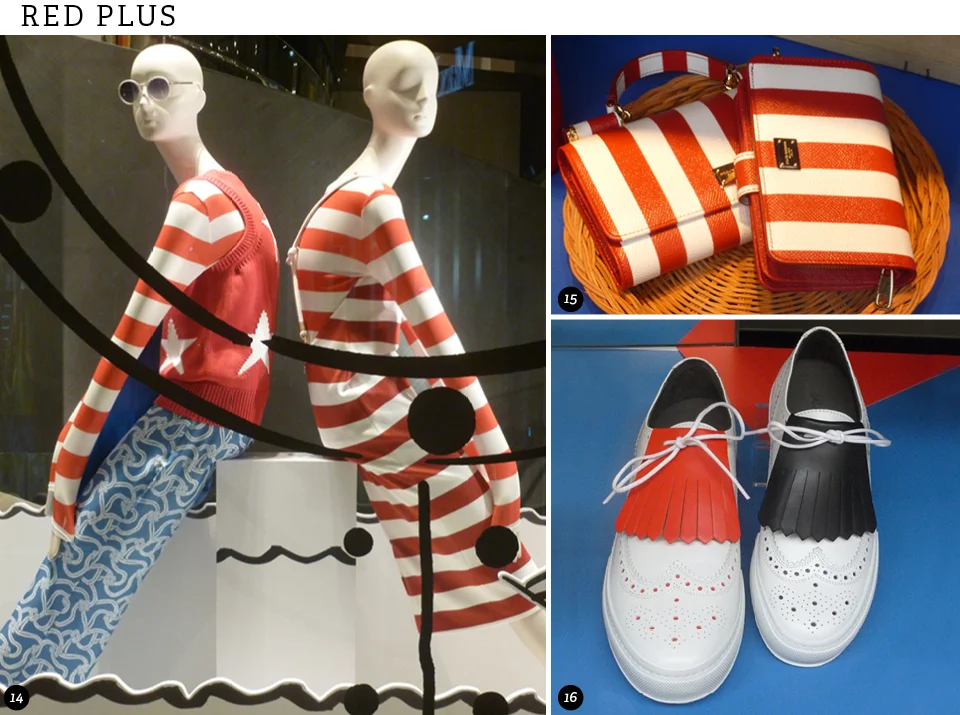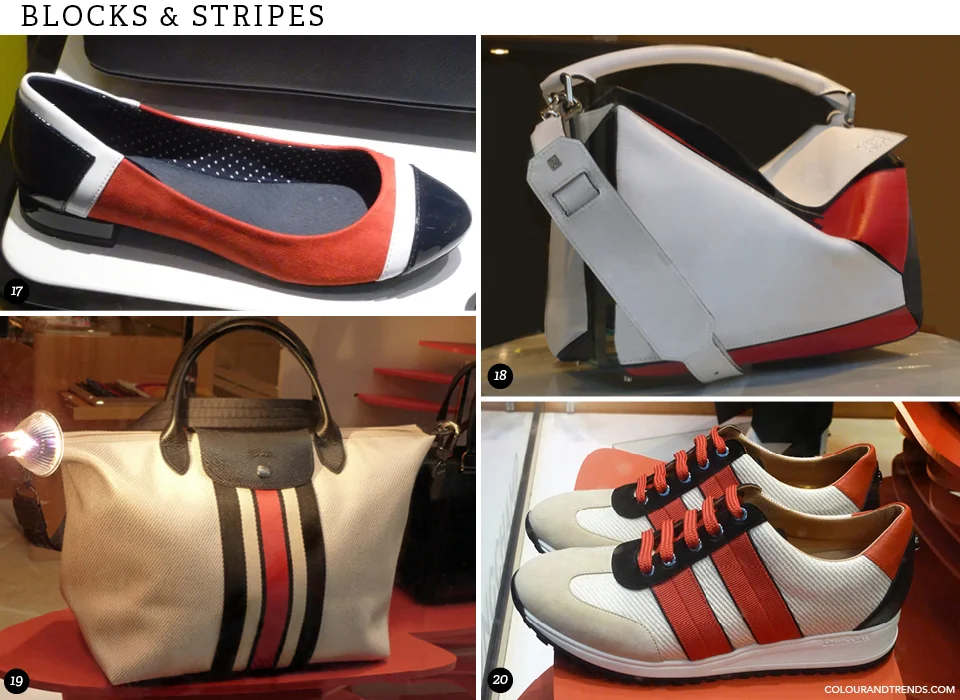 Black and white and red and navy are often referred to as “spectator” combinations, a colour story that always signals a fresh start for spring. Milan was at the forefront with plenty of red and white, red, white and black and/or navy colour combinations, not only in ready-to-wear fashions but in shoes ready for the golf course as well as small leather goods.