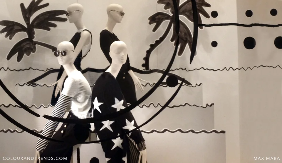 Clean graphics were the backdrop in many designer flagship stores. Simple shift dresses in lace, satin or a rubberized perforated material in front of a grid added a graphic mood to classic black and white at Tom Ford. Max Mara opted to transport black and white to the tropics with palm trees in the background and plenty of star motifs.